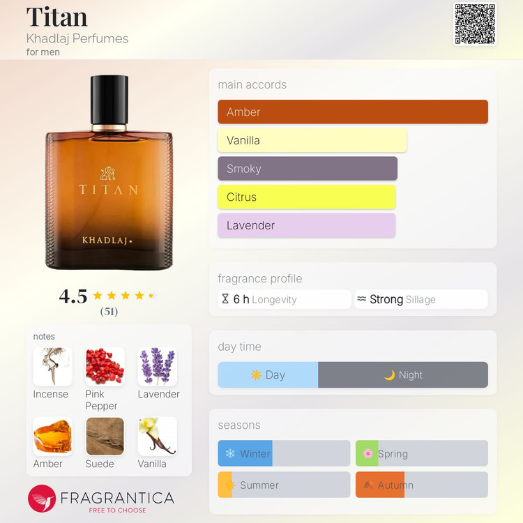 در نت پایانی، ترکیب وانیل، عنبر، مشک و چوب صندل رایحه را گرم، عمیق و ماندگار میکند؛ پایانی کرمی، جذاب و اغواگر که امضای اصلی تایتان خدلج است.